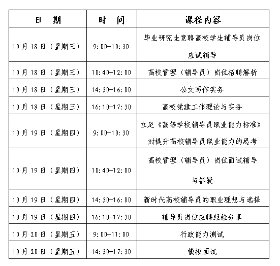 培训面向有意愿从事高校管理工作及思想政治工作的在校研究生(含硕士生和博士生),旨在帮助研究生充分了解高校管理(辅导员)岗位的政策、工作内容并提升求职技能与技巧,促进研究生做好求职应聘的相关准备,增强研究生应聘高校管理(辅导员)岗位的契合度与竞争力。