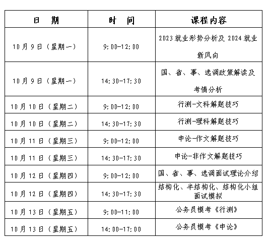 培训面向有意愿考取公务员、选调生,毕业后从事国家公务管理工作的在校生(含本科生、硕士生和博士生),旨在帮助毕业生充分了解2024年国考、省考、各省市(区)选调优秀毕业生考试相关政策,掌握应试技巧,提高应试能力。