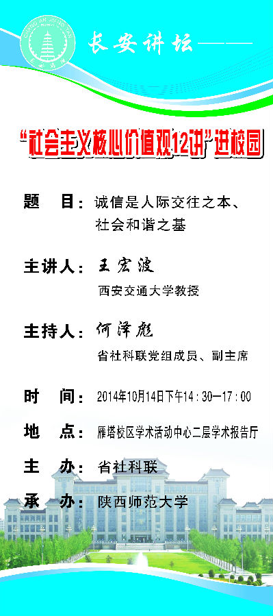讲座题目:长安讲坛——“社会主义核心价值观12讲”进校园:诚信是人际交往之本、社会和谐之基