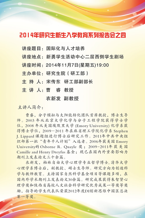 讲座题目:2014年研究生新生入学教育系列报告会之四:国际化与人才培养