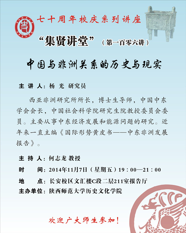 讲座题目:迎70周年校庆系列学术讲座之集贤讲堂106讲:中国与非洲关系的历史与现实